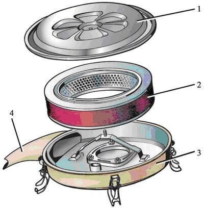 Рис. 15. Воздушный фильтр: 1 — крышка; 2 — фильтрующий элемент; 3 — корпус; 4 — воздухозаборник