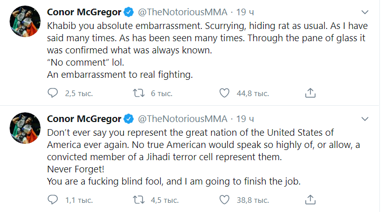 Бойцы смешанных единоборств не дают скучать своим фанатам. И для этого им не обязательно выходить в октагон. Конор Макгрегор и Хабиб Нумагомедов вчера вечером устроили очередную шумную перепалку в твиттере. По ходу дела ирландец задел и Тони Фергюсона, и Джастина Гейджи, и Али Абдель-Азиза, и всю Россию. Все началось со своеобразного анализа Конором, прошедшего 10 мая боя за временный пояс чемпиона в легком весе между Тони и Джастином рассуждений о своих планах. Этот спорт делают фанаты! Я против того, чтобы идти на бой без них. Но я буду рад показать им всю силу, которой обладаю на фоне полной тишины. Против Джастина буду драться я, потому что Хабиб самый большой уничтожитель бутылок в игре. Уверен в этом. Дальше Конор прошелся по Тони и упрекнул того в уходе из бывшей команды. Я люблю Тони. Мы отлично представляли вместе команду Paradigm пока ему не пообещали контракт (в бейсболе). Его подготовка к бою была ужасной.