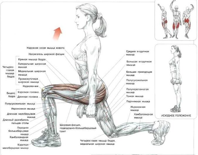 (ЧАСТЬ 2) Выпады веред Эффективное упражнение для похудения ног. Во время приседаний важно, чтобы бедро, которое выходит вперед оказалось параллельно полу, а в коленях образовывался прямой угол. Подъем таза Помогает сформировать красивые и сильные ягодицы. Это упражнение также известно как ягодичный мостик. Лягте на спину. Руки вытяните вдоль тела. Ладони прижаты к полу ладонями вниз. Ноги согнуты и подтянуты как можно ближе к области ягодиц. Ступни ног и колени - на ширине бедер. Поднимите таз вверх так, чтобы корпус образовал прямую линию с бедрами. Следите за тем, чтобы упор делался на пятки. Достигнув верхней точки движения, максимально напрягите мышцы ягодиц. Сохраняйте это положение в течение 2–5 секунд. Важно, чтобы во время всего упражнения нагрузка приходилась именно на ягодицы. В последнем случае вы явно что-то делаете неправильно. Опускайтесь вниз медленно в течение 1–2 вдохов, избегая рывков и резких движений. Старайтесь не касаться пола ягодицами. Сделайте 2-3 подхода п
