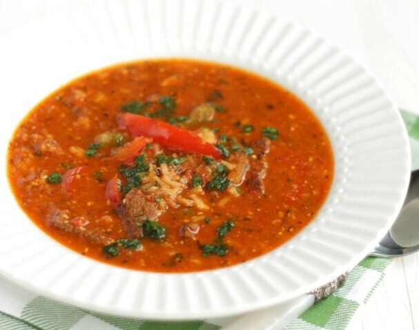 Ингредиенты: 1 Мясо хорошенько вымойте и тщательно высушите. Нарежьте на небольшие полоски. Приправьте солью, перцем и острой паприкой. Обваляйте мясо в муке. На небольшой сковороде разогрейте немного оливкового масла и обжарьте мясо 2 Тем временем мелко нарежьте лук и чеснок. Обжарьте лук вместе с чесноком до золотистого цвета. Болгарский перец нарежьте полосками. 3 В большой кастрюле доведите воду до кипения. Опустите туда мясо и лук. Добавьте томатный соус, айвар, сушеные травы и специи. Нарежьте мелко орехи и также добавьте в суп. 4 Варите на медленном огне около 1,5 часа. Затем добавьте рис и болгарский перец. Варите еще 20-30 минут. В конце добавьте большое количество мелко нарубленной свежей зелени. 5 Приятного аппетита!