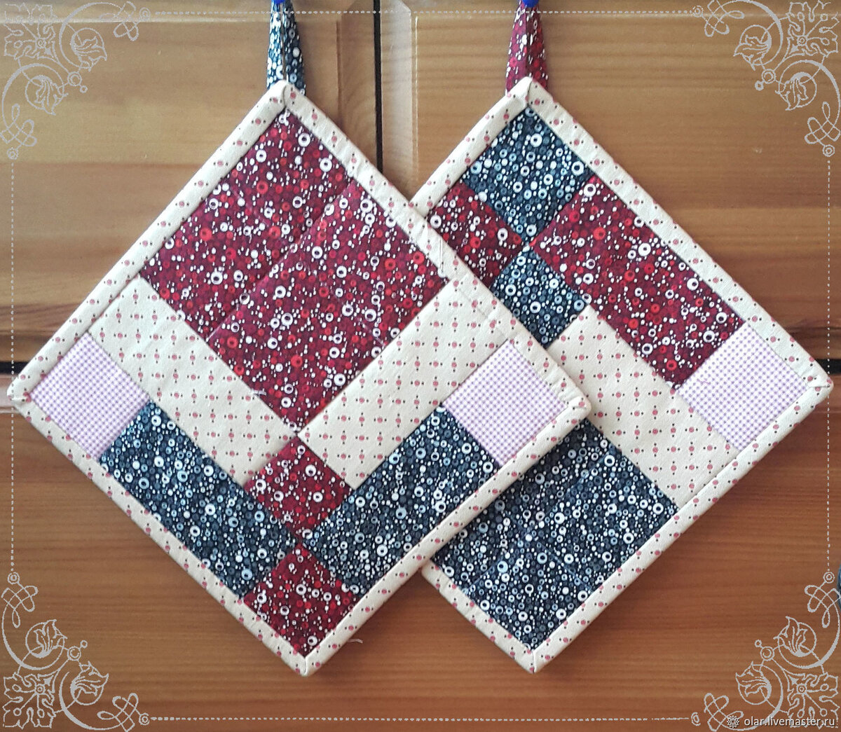 Как я уже говорила, вязание я люблю больше, чем шитье. Это сугубо индивидуально. Но, именно в вопросе прихваток, на первое место я бы поставила сшитые экземпляры. Очень интересные вещицы получают в стиле пэчворк. Можно брать сходные по цветовой гамме отрезы ткани, либо акцентировать внимание на контрасте лоскутов.