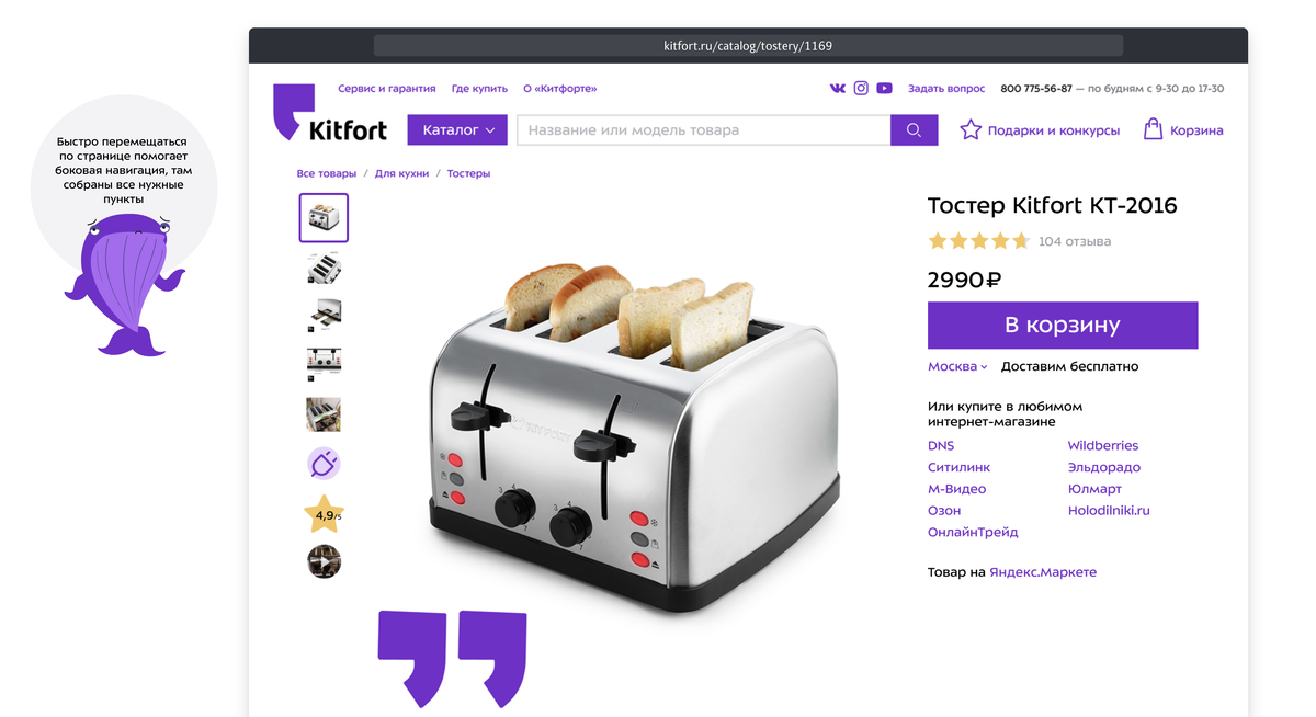 Новый Kitfort — просто пушка среди монобрендовых сайтов электроники. Студия Лебедева запилила прекрасный кейс для такого рода проектов. Отличия: – Новизна и разнообразие контента – Отстройка от конкурентов буквально каждым элементом – Переосмысленная карточка товара – Максимальный фокус на информации (в шапке лишь два элемента) – Переосмысленный листинг товаров в каталоге (где фотка на белом, которых уже тьма, а где изображение с приглашением заглянуть, а ещё где инстапост вообще) – Наглядное решение «болей» покупателей (Я люблю…/Я ненавижу то-то) – Мегасетка товаров – Грамотная работа с экранами большой диагонали Оригинал поста в моём канале https://t.me/dgtlist/2337