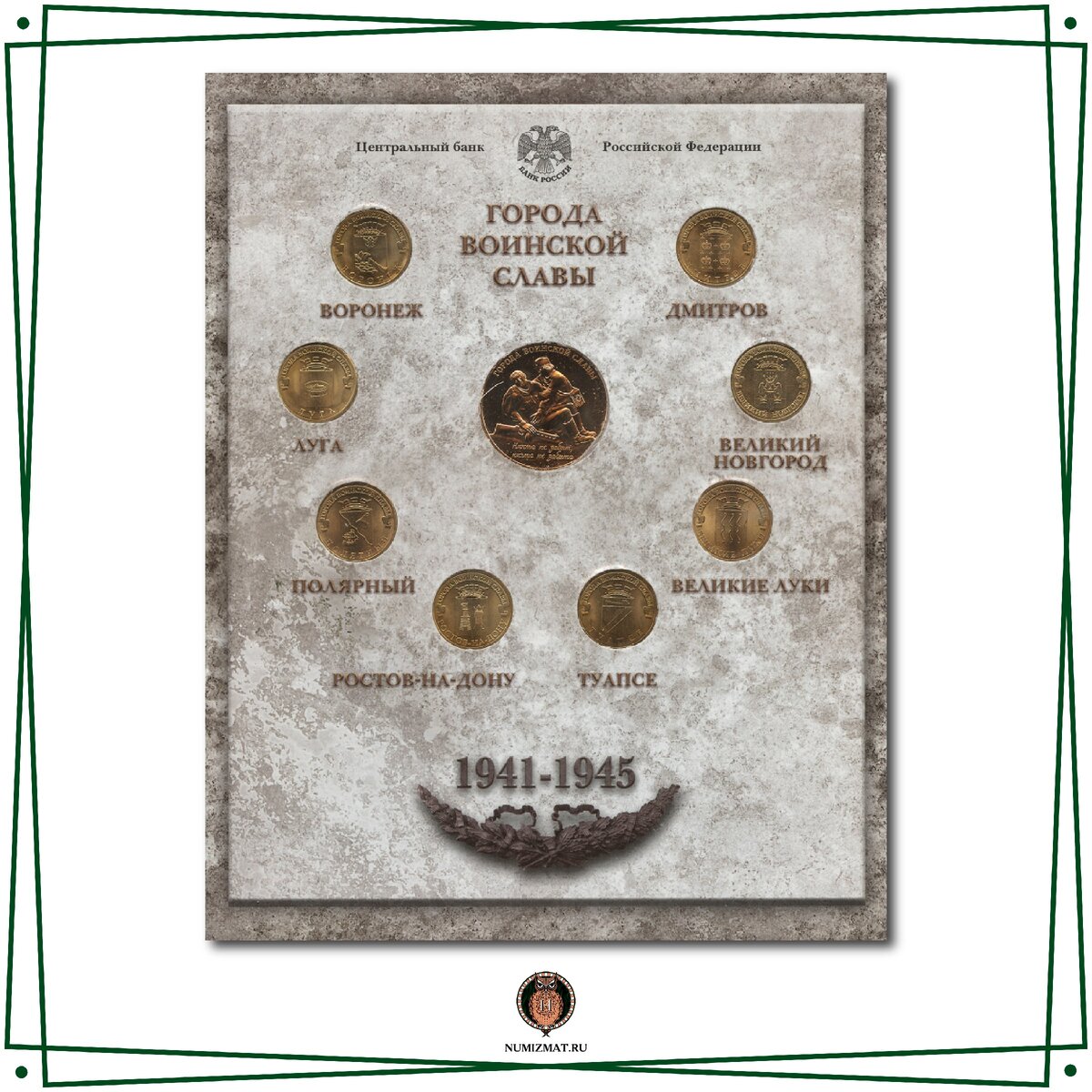 В 2012 состоялся второй официальный гознаковский выпуск подарочного альбома монет серии «Город воинской славы», которые Центробанк России начал чеканить с 2011 г. Серия пополнилась еще восемью монетами, посвященным городам – символам воинской доблести в период Великой Отечественной войны. Как и предыдущий, выпуск новых монет соответствовал хронологии присвоения званий. Великий вклад некоторых городов в общую победу наименее известен в истории войны. ⭐️ Оборона Воронежа сыграла важную роль в ходе военной кампании 1942. В течение 178 дней линия фронта делила город пополам, но восточную часть противнику взять не удалось. В ходе нашего наступления в январе 1943 были разгромлены три армии противника: немецкая, венгерская и итальянская. Наши потери составили 400 тыс. воинов. ⭐️ Героическая оборона Луги задержала противника и спасла осажденный Ленинград ценой окружения и гибели своего гарнизона – 43 тыс. солдат. ⭐️ Полярный сыграл ключевую роль в обороне Заполярья, став последним рубежом наш