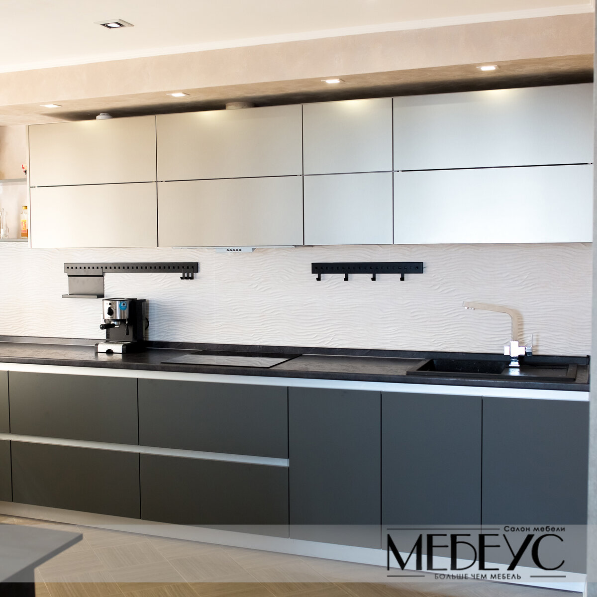 Все новинки быстро попадают к нам в офис и конечно же мы стараемся предлагать их клиентам в первую очередь:) Ведь как известно делая одно и тоже каждый день, нам просто будет нечего показать. И так на этой кухне мы использовали новинку от компании AGT Турция, фасадную панель с декором под шлифованную сталь (верхние фасады и пеналы). Тактильно фасад на 99% передает ощущение стали, но по факту это тонкий слой фольги нанесённый на МДФ (основа для многих фасадов). Верхние фасады идеально сочетаются с алюминиевыми профилями и цоколем установленными в нижние базы кухни. На нижних фасадах такие же панели AGT только цвет серый матовый. Визуальное восприятие можете посмотреть на фото! в живую конечно выглядит в несколько раз круче! Поставили бы себе такие фасады?