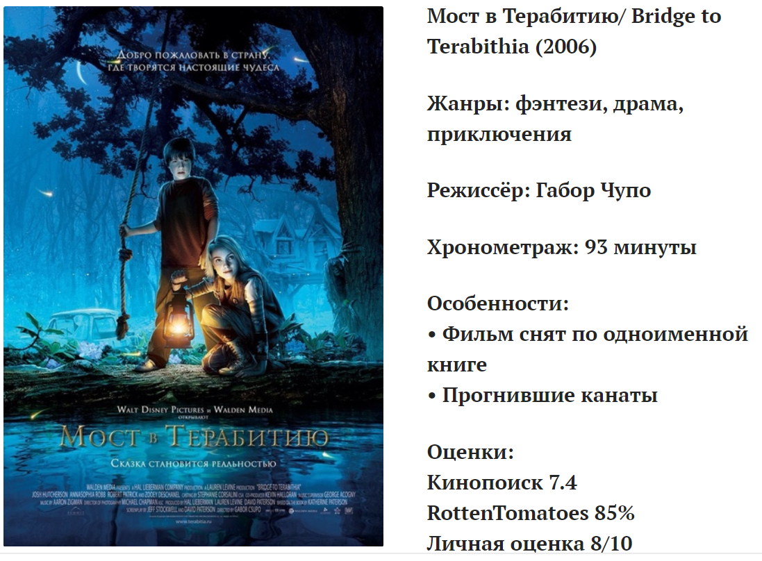 Да что уж сказать, про это кино я вообще вспомнил, увидев смешную картинку на просторах ВКонтакте. Что же, как рад, что мне повезло его посмотреть... Сюжет Чудаковатый американский неудачник Джесси(Джош Хатчерсон), обожающий школьные забеги до столба и яркие зарисовки в блокноте, знакомится с Лесли(Анна-София Робб) - новой одноклассницей, которая тоже может в бег и вообще очень классная, ещё и сосед. В процессе дружбы они придумывают себе волшебную страну, в которой и тусят после школы. Встреча с девочкой меняет жизнь Джесси в лучшую сторону, и проблемы уже не кажутся такими насущными, здорово же? Композиция Повествование тут на самом деле назвать динамичным язык не поворачивается - весь фильм нам показывают какие-то сцены из подростковой жизни, тут и балбесы в джемперах отбирающие сэндвичи и девк