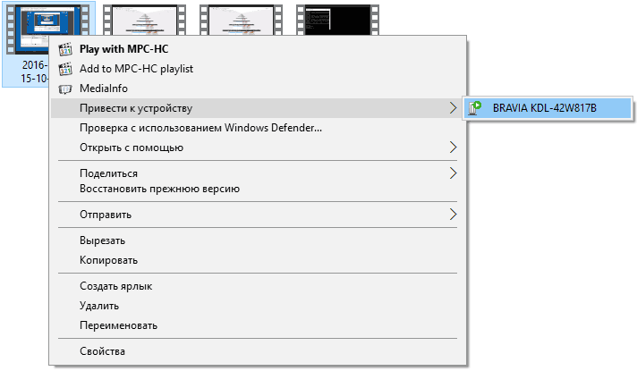 Все, что требуется сделать — кликнуть правой кнопкой мыши по, например, видео файлу (или папке с несколькими медиа-файлами) и выбрать «Передать на устройство…» («Привести к устройству…»), затем выбрать в списке нужное (при этом, чтобы оно отображалось в списке, требуется чтобы оно было включено и находилось в сети, также, если вы видите два пункта с одинаковым именем, выбирайте тот, который имеет иконку как на скриншоте ниже).