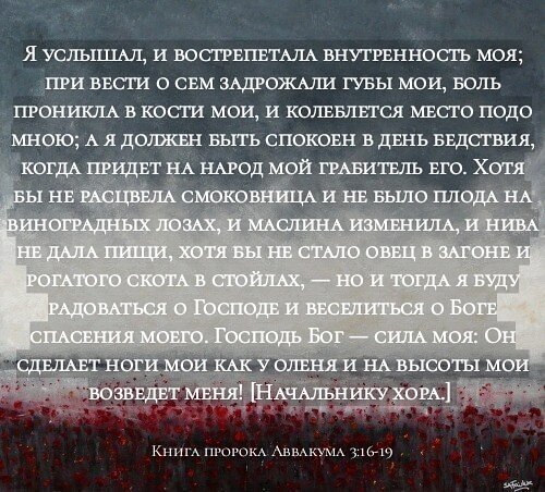 В трудные времена, мы должны сохранять спокойствие и доверие Богу, это не значит, что мы не должны ничего чувствовать и быть безразличными. Да, нам может быть и страшно, и больно ("боль проникла в кости мои"), и все обстоятельства будут идти против нас ("колеблется место подо мной"), будут в действительности тяжёлые испытания. И когда придёт "грабитель", а он придёт, мы должны сохранять спокойствие, доверие и верность Богу, не поддаваться всеобщей панике. Когда все очевидно худо и плохо вокруг, и все привычное вдруг уходит из под ног, у нас всегда есть Господь, и мы можем и должны непрестанно радоваться о Господе и благодарить Его. Да, иногда это очень сложно сделать, не всегда и не сразу это получается, но через эти трудности мы приобретаем опытность. Нужно огромное доверие Богу, чтобы поблагодарить Его за эти испытания, что Он не оставит и выведит. И это благоугодная жертва хвалы для Бога! Благодарить Бога, когда все хорошо - это не жертва, так делают все. Господь никогда не дает с