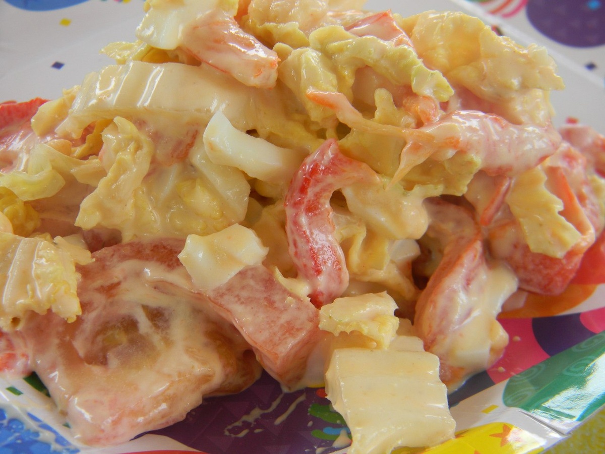 Салат Дельфин5 сладких перцев300гр.пекинской капусты,3помидора,3 вареных яйца,300гр. очищ.креветок,1ч.л. горчицы,4ст.л. сметан,сольКапусту тонко нашинковать, помидоры нарезать по желанию. Перец запечь в духовке, очистить удалить семена, нарезать соломкой и смешать с нарезанными овощами.Добавить креветки, заправить смесью сметаны и горчицы, посолить и перемешать.