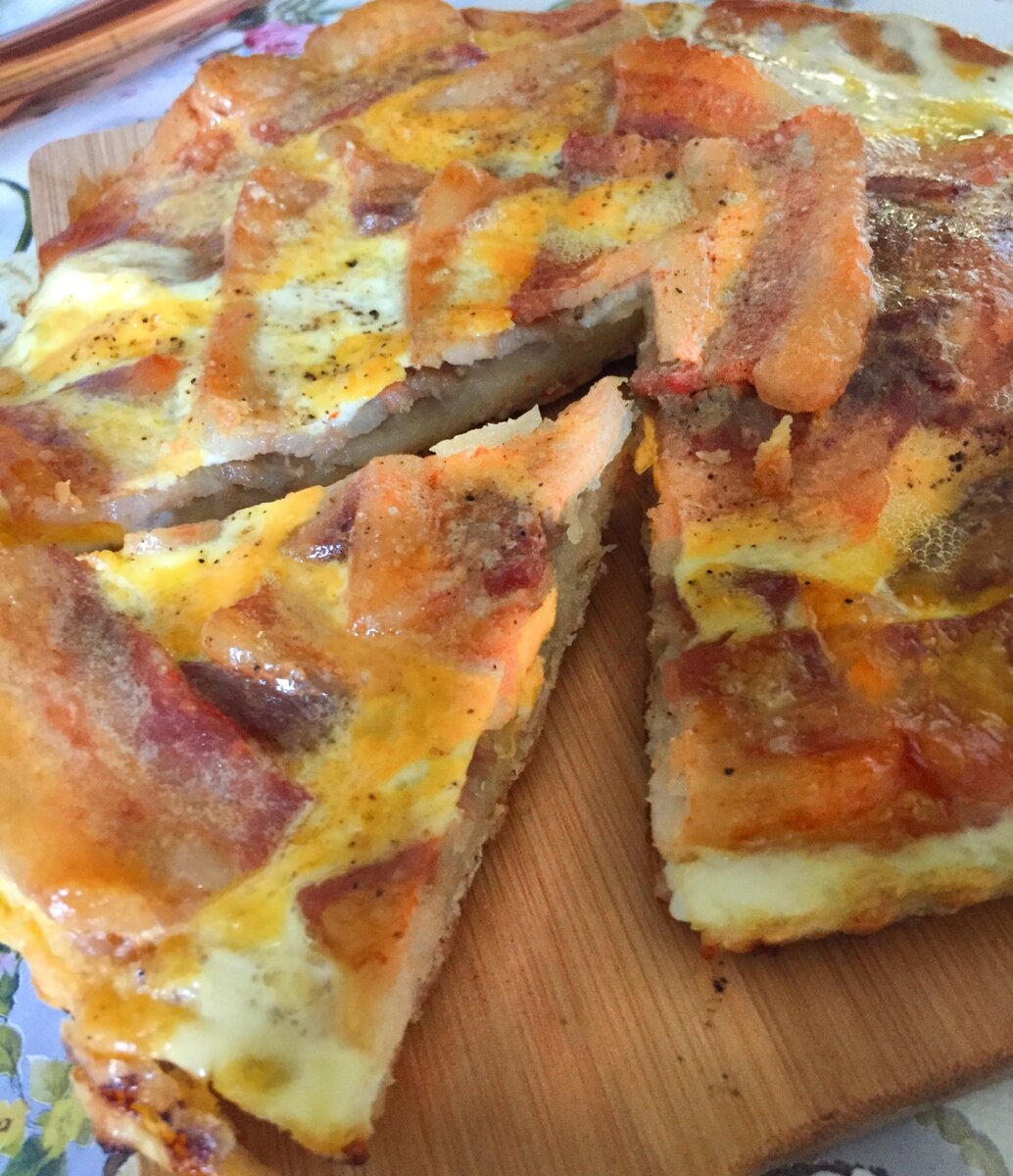 Очень быстрый и простой рецепт сытного пирога. Я готовила из дрожжевого теста, но вам советую из слоёного. ИНГРЕДИЕНТЫ Бекон—300 г Слоеное тесто—400 г Яйцо куриное—4 штуки Соль по вкусу Перец черный молотый по вкусу Мука ИНСТРУКЦИЯ ПРИГОТОВЛЕНИЕ: Раскатать тесто. Уложите его в форму (или просто на противень). Сверху положите бекон. Выпекайте в духовке при температуре 220 градусов, пока бекон не приобретет золотистый цвет. Выньте противень из духовки и разбейте яйца прямо на тесто, добавьте специй и снова выпекайте минут 10. Готово! Приятного аппетита!