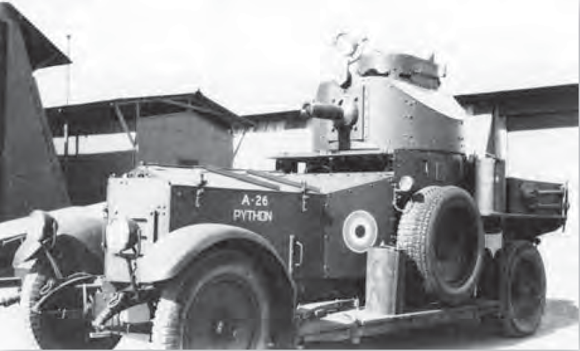 Rolls-Royce 1920 Pattern MkIA Страна изготовления: Великобритания Год производства: 1930-1932 Производитель: Royal Ordnance Factory (Woolwich). Шасси: Rolls-Royce 40/50HP Кол-во выпущенных: 10 Боевая масса: 3900 кг Размеры: 4877х1905х2311 см Двигатель: Rolls-Royce 40/50HP 6428ccm, 65 л.с. Максимальная скорость: 95 км/час Бронирование: 8 мм Вооружение: .303 Vickers maschine gun MkI, infantry pattern Экипаж: 2-3 В 20-е годы 20-го века, после окончания первой мировой войны армия и флот Великобритании обживали новые колонии, оторванные от Турции, и со старыми колониями то же расставаться не собирались. По прежнему универсальным средством оставалась колесная бронетехника. Несмотря на появление в колониях первых танков, боевой работы им не было, кроме обороны казарм и укреплений, а так же тренировки тактики применения делать им было нечего ни в Месопотамии, ни в Палестине, ни в Египте, ни в Индии. Оставалось только поддерживать в строю то, что было - бронеавтомобили. В начале 30-х сове