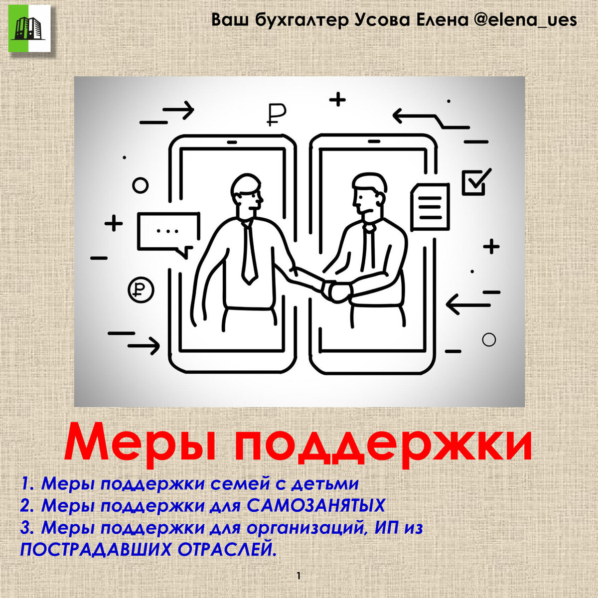 1. Меры поддержки СЕМЕЙ с ДЕТЬМИ · Все семьи с детьми до 3-х лет получат ежемесячную выплату в размере 5000 руб., с апреля – июнь 2020 год; · С 01.06.2020 года единовременная выплата в размере 10000 руб., на каждого ребенка с 3-х до 16 лет ( подать заявление можно через госуслуги или сайт ПФР) Заявление можно подать уже с 12.05.2020 года!; · Ежемесячная выплата на каждого ребенка с 3-х до 7 лет начиная с июня 2020 года. Пособие вводится с 01.01.2020 года и семья его сможет получить разово за период с января – июнь (среднедушевой доход которых не превышает величину прожиточного минимума); · Минимальное пособие по уходу за ребенком до 1,5 лет повысится с 3375 руб., до 6751 руб. 2. Меры поддержки для САМОЗАНЯТЫХ · Предоставление налогового вычета в размере 1МРОТ за 2020 год (равный 12130 руб.); · Возврат оплаченного в 2019 году налога на профессиональный доход в полном объеме. 3. Меры поддержки для организаций, ИП из ПОСТРАДАВШИХ ОТРАСЛЕЙ · Полное списание налогов и взносов (кроме НДС