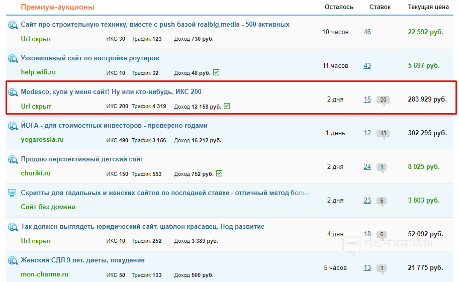 Все сделки по сайтам проводятся в виде аукциона. Продавец выставляет стартовую цену, а покупатели в течение определенного времени пытаются выкупить ресурс.