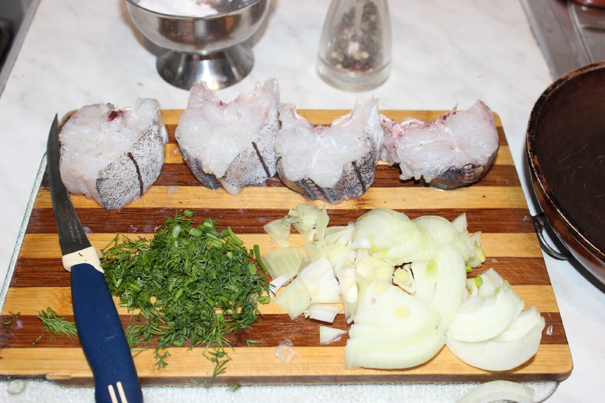 Жареная рыба в луке. Чистим рыбку. Нарезаем стейками. Чистим и нарезаем лук. На растопленное масло выкладываем лук, сверху выкладываем стейки из рыбы. Солим. Перчим. Посыпаем зеленью. Обжариваем стейки с 2 сторон. Выкладываем по кусочку подсолнечного масла на каждый стейк и на 5 минут накрываем крышкой и жарим еще 5 минут. Как всегда просто и быстро и полезно. Наверное, никто не будет спорить с тем, что рыба несет несомненную пользу для человеческого организма. В ее состав входит белок, в котором содержаться все необходимые аминокислоты.Так же стоит отметить, что жареная рыба достаточно быстро переваривается. В особенности это полезно для людей, страдающих от пониженной кислотности. После приема данного блюда они не будут чувствовать тяжесть в животе.В жирных сортах рыбы отмечено высокое содержание липидов известной всем омега – 3.Так же стоит отметить, что жиры, входящие в состав рыбы ведут борьбу с холестерином, что уже полезно для сердца и сосудов. Всем здоровья и приятного апп