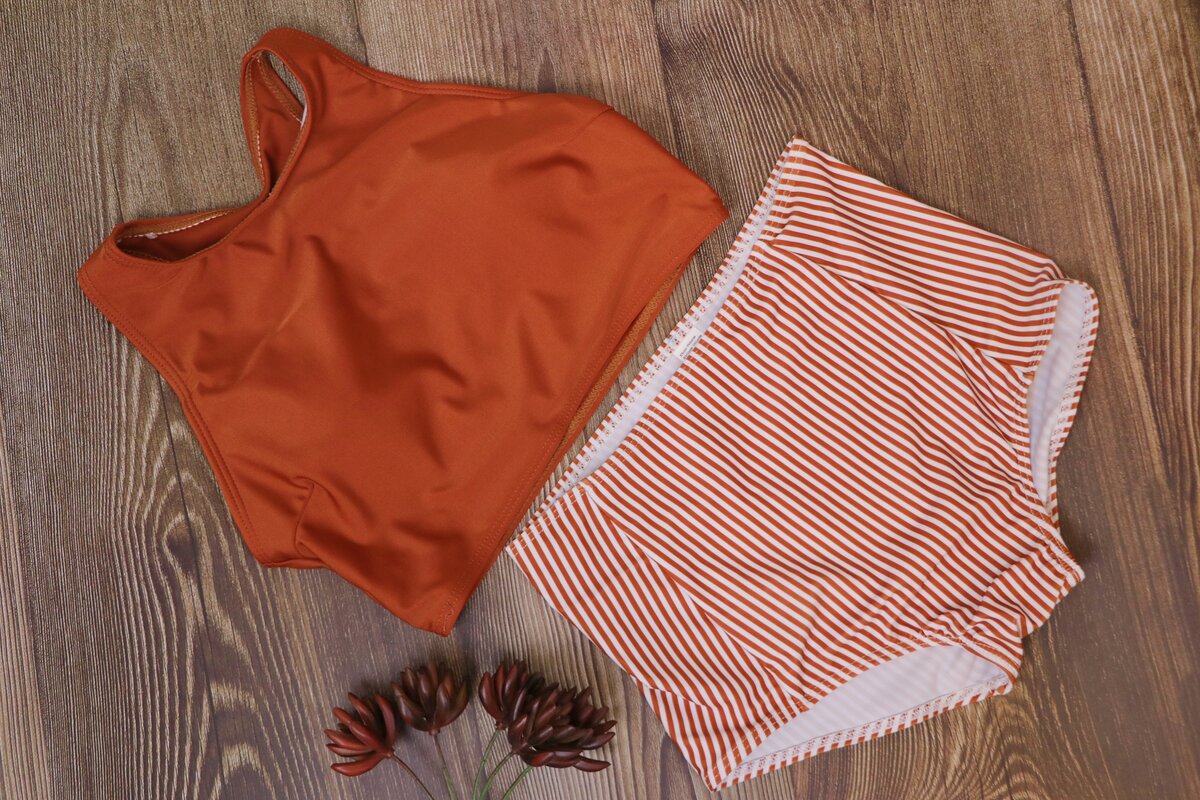 Расцветкой я осталась довольна: верх - однотонный кирпичного цвета, плавки - в полоску (чередование белого и кирпичного цветов). Смотрится шикарно.