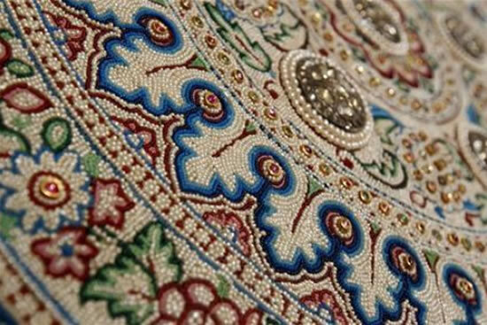 На шелке, укрепленном оленьей кожей, из мелкого жемчуга и бусин из цветного стекла и самоцветов вытканы сложные узоры, по центру ковров расположены розетки, выложенные небольшими плоско ограненными алмазами в обрамлении золотых пластин.
