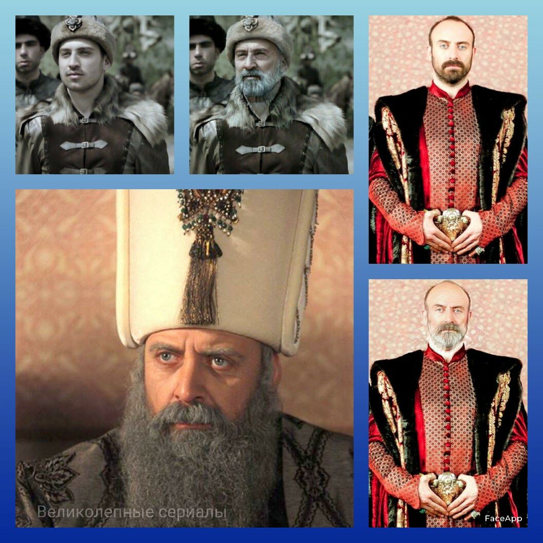 Здравствуйте, уважаемые читатели! Как мы прекрасно знаем, красота не вечная, на смену гладкой кожи - приходят морщины. Время не изменить, поэтому в сериале "Великолепный век" мы наблюдаем грим на актёрах, а так же их смену, но зачастую меняли актёров лишь в ценах, где они совсем молоды. Сегодня я решила пофантазировать и хочу вам показать постаревших персонажей в сериале и в фотошопе. Приложение - FaceApp. Статья является шуточной :) Султан Сулейман. Вашему внимаю - Султан Сулейман. 1 фото ( левый верхний угол ) молодой актёр исполнилвший молодого Сулеймана - Эрол Айваз. На фото он представлен молодым, а уже справа - постаревшим. Как по мне такой Сулейман сильно отличается от старого Сулеймана в исполнении Халита Эргеча. Следуйщий как раз он ( правый верхний угол, старый - правый нижний угол ), на 1 фото он молодой, а на втором уж очень отличается старого в сериале, акцент больше на седине бороды, нежели чем на лице. Далее ( левый нижний угол ) сериальный старый Султан. Хюррем-Султан.