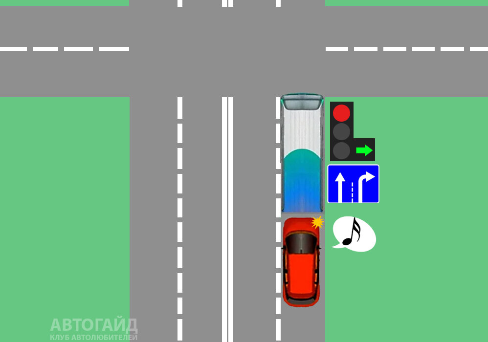 Впереди перекресток, причем регулируемый. Основная секция светофора горит красным, но стрелка направо разрешает поворот. Однако совершить маневр мешает впереди стоящий автобус, который хочет проехать прямо и дожидается зеленого сигнала.