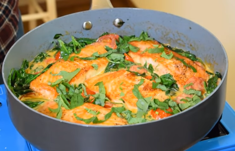 Блюдо, которое всегда съедается до последнего кусочка - лосось в сливочном соусе. Рыбка всегда получается невероятно нежной. Я просто обожаю этот рецепт. Итак приступим... В первую очередь филе лосося (либо любой другой рыбы, на ваше усмотрение) необходимо посолить и поперчить с двух сторон. Ставим на плиту сковородку, добавляем оливковое масло и хорошенечко ее разогреваем. Выкладываем нашу рыбку на сковородку. Обжариваем с одной стороны в течение 4 минут, с другой стороны в течение 2-х минут. После того, как рыбка обжарилась в сковороду добавляем сливочное масло и мелко нарезанный чеснок. Чеснок слегка обжариваем. Затем к чесноку отправляем предварительно помытые и нарезанные томаты. Я использовала томаты чери. Вы можете взять обычные томаты. Даем томатам немного обжарится в течение 1,5-2 минут. К томатам добавляем шпинат. Также предварительно промытый и хорошенько просушенный. К смеси шпината и томатов добавляем сливки. Туда же отправляем пармезан. Можно использовать тот сыр, котор