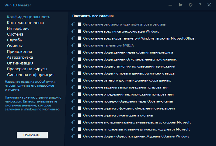 - Если вы из тех пользователей, которые действуют по принципу: отметить все доступные пункты чтобы «максимально оптимизировать» Windows 10 и применить их — Win 10 Tweaker не для вас. Впрочем, ни одна из аналогичных программ не предполагают такого сценария использования.