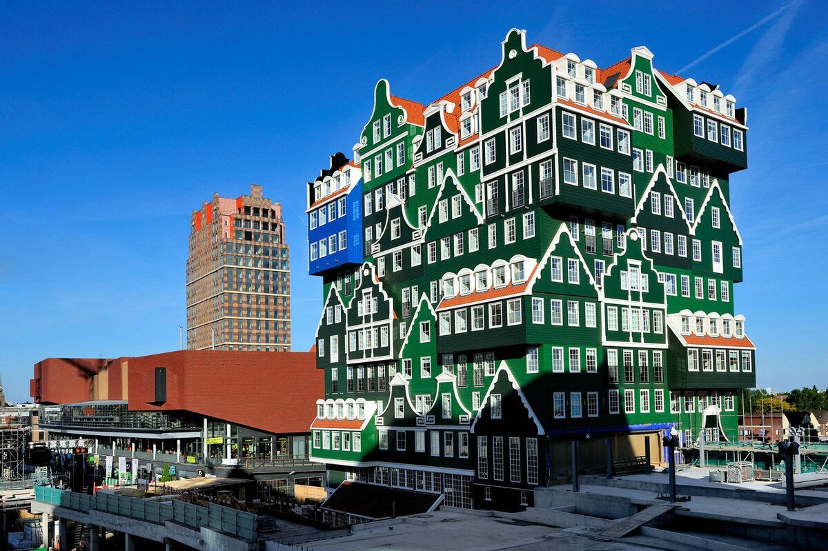 Там - это в городе Заандам (Zaandam), недалеко от Амстердама. В 2010 году свои двери открыл уникальный отель - Inntel Hotels Amsterdam Zaandam. За ярким и причудливым внешним видом есть все, что нужно для комфортного проживания. Отель как будто состоит из множества домиков (по задумке архитекторов их всего семьдесят), выполненных в традиционном голландском стиле и лишь один выделяется голубым цветом. Архитекторы это сделали в честь картины "Голубой дом в Заандаме" французского живописца Клода Моне, который провел в городе четыре месяца, создав 25 картин и 9 набросков. В общей сложности в отеле 160 номеров, один из которых сделан в честь Петра I. Интерьер номеров отражают богатую историю Заандам: традиционные продукты, пионеры местной ремесленной промышленности и семьи, которые сделали этот район всемирно известным. Отель Inntel Hotels Amsterdam Zaandam, находится в городке Zaandam возле железнодорожного вокзала, с которого за 12 минут можно добраться до Амстердама. А стоимость за ноч
