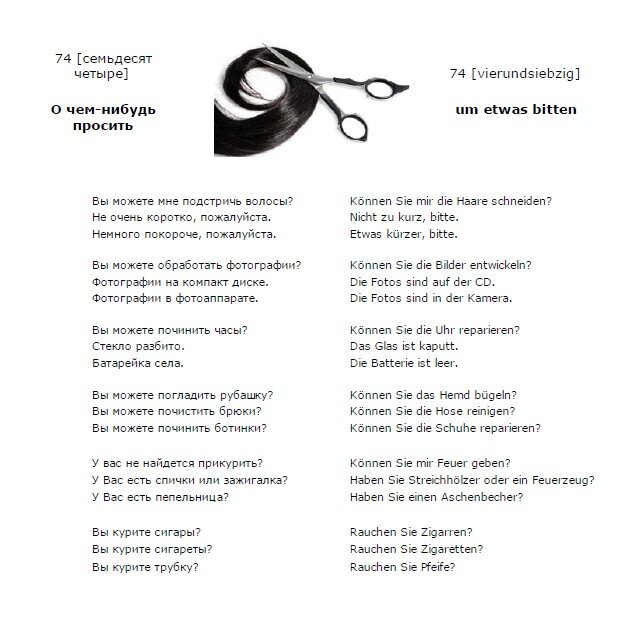 Немецкий язык. Урок 1. Немецкий язык. Урок 73. Добрый день! Продолжим изучение немецкого языка. Немецкий язык. Урок 74. 74 (семьдесят четыре) - 74 (vierundsiebzig) О чем-нибудь просить - um etwas bitten Вы можете мне подстричь волосы? - Können Sie mir die Haare schneiden? Не очень коротко, пожалуйста. - Nicht zu kurz, bitte. Немного покороче, пожалуйста. - Etwas kürzer, bitte. Вы можете обработать фотографии? - Können Sie die Bilder entwickeln? Фотографии на компакт диске. - Die Fotos sind auf der CD. Фотографии в фотоаппарате. - Die Fotos sind in der Kamera. Вы можете починить часы? - Können Sie die Uhr reparieren? Стекло разбито. - Das Glas ist kaputt. Батарейка села. - Die Batterie ist leer. Вы можете погладить рубашку? - Können Sie das Hemd bügeln? Вы можете почистить брюки? - Können Sie die Hose reinigen? Вы можете починить ботинки? - Können Sie die Schuhe reparieren? У вас не найдется прикурить? - Können Sie mir Feuer geben? У Вас есть спички или зажигалка? - Haben Sie Streichhöl