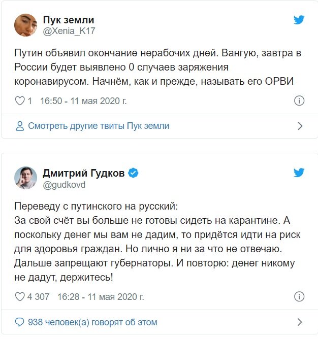 Владимир Путин в шестой раз обратился к населению страны. В своем обращении он отметил, что не будет продлять единый период нерабочих дней, который был объявлен с 30 марта. По словам президента, с 12 мая единый период нерабочих дней завершается, но окончательное решение об изменении режима остается за главами регионов. В соцсетях пользователи отреагировали на послание неоднозначно. Многие отметили, что свое решение Владимир Путин озвучил в день, когда было объявлено о рекордном количестве человек, у которых диагностировали коронавирус за сутки — 11 656 человек.