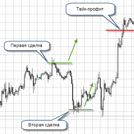 Там, где должен быть стоп-приказ, трейдер устанавливает отложенный ордер, направление которого соответствует предыдущему. Тейк-профит смещается на середину расстояния между данными ордерами. Если происходит возврат цены, сделка закрывается по тейк-профиту, трейдер не получается прибыли, но и не несет убытков. Практическое исполнение: