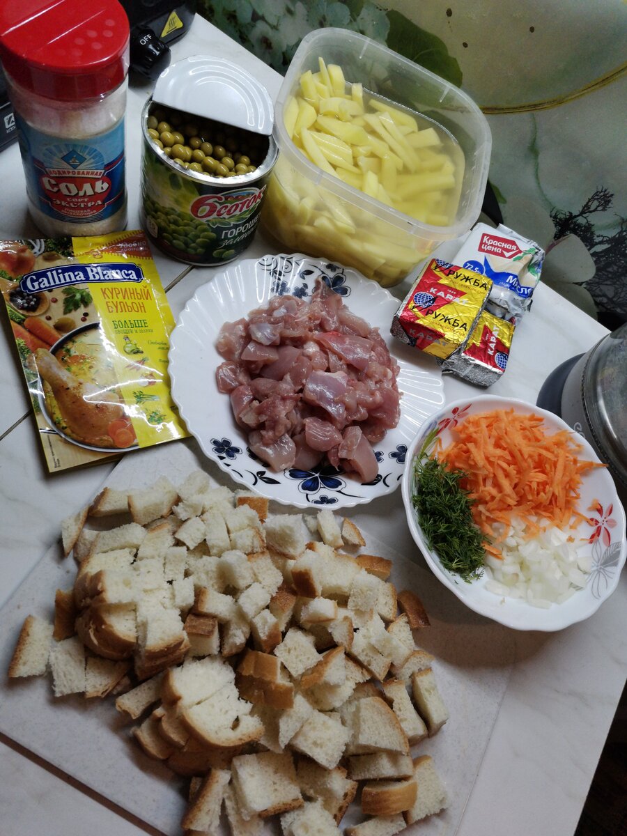 Моя семья его обожает Ингридиеты : -картофель 5-6 шт (средних) нарезанный небольшими брусочками -курица 500 гр нарезанная небольшими кусочками -морковь 1 шт натёртая на тёрке -лук 1 шт мелко нарезанный -сырок типа "дружба" 2 шт -зелёный горошек 1 банка (в идеале, конечно замороженный горошек, но у нас не было в магазине, пришлось брать консервированный) -свежий укроп -соль, перец, специи по вкусу -сливочное масло для жарки -вермишель "паутинка" Для сухариков : -хлеб нарезанный кубиками -сливочное масло для жарки -специи по вкусу (у меня бульон "магги") Приготовление : -ставим варится картофель и мясо -на сковороде обжариваем морковь и лук на сливочном масле (можно и на растительном, но вкус будет не такой сливочный) -когда картофель почти готов (примерно минут 20-30 варки) добавляем сырок и зелёный горошек, хорошо перемешиваем -варим ещё минут 5, перемешивая до растворения сырка -солим, перчим -добавляем немного вермишели, примерно жменьку и варим 3 минуты -посыпем укр