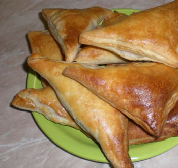 Тесто достаньте из холодильника, разверните и удалите пищевую плёнку, раскатайте его не очень тонко и не очень толсто .его оптимальная толщина должна составлять около 0,5 см. Тесто нарежьте на квадратные куски размером 7Х7 см. Ложкой выложите аккуратно вишневую начинку, квадратные куски теста сверните таким образом, чтобы получились треугольники и залепите края.