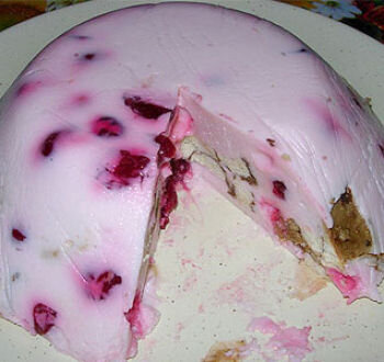 Далее при помощи водяной бани или микроволновки доводим желатин до окончательного растворения. В микроволновку его достаточно поместить на 30 секунд. Что касается водяной бани, то этот способ намного эффективнее, но сложнее. В кастрюлю набираем воды, а желатин перекладываем в миску, которая по размеру подходит горлышку кастрюли. Доводим воду до кипения и вставляем емкость с желатином в кастрюлю. Периодически помешивая растворяем полностью желатин на пару, после чего даем ему немного остыть. Затем выливаем всё в йогуртовую смесь тщательно перемешивая всю массу миксером. Добавляем туда же ягоды и раскрошенное печение. Измельчить его можно как руками, так и при помощи ножа. Единственное условие: делать все это надо очень быстро – от этого напрямую зависит правильность приготовления десерта. Получившуюся массу выливаем в миску и, будучи остывшей, накрываем куском пищевой пленки и ставим в холодильник, лучше всего на всю ночь. За это время печенье, как следует, размокнет и будет напоминать нам бисквиты.