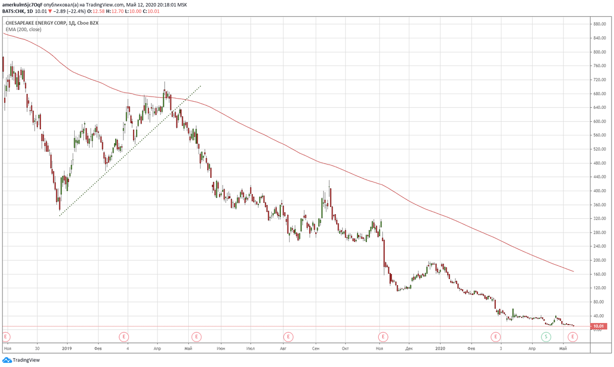 Чесапик - пионер сланцевой добычи ожидает банкротства. Сегодня пионер сланцевой добычи, Чесапик получил убыток на акцию стоимостью 8,5 ярдов, что означает чистый убыток не много и не мало 850 долларов на акцию. Напомню, что сегодня акция торгуется в районе 10 долларов что в сто раз меньше, чем это было еще год назад. А это значит одно, если даже компания и продолжит свою деятельность, то прошлогодние акционеры вряд ли в скором времени получат полноценный возврат на свои инвестиции. Кто виноват понятно - короновирус и недоговоренности ОПЕК+, однако вопрос что делать висит в воздухе. Висит этот вопрос не только сегодня, ведь компания Чезапик уже неоднократно снижала свою стоимость на неполных 100%. Например похожее снижение было по итогам 2014, 2015 годов на фоне второго после 2008 снижения нефтяных котировок. В 2008 акции также не порадовали своих акционеров, рухнув вслед за нефтью на 90%. А затем затяжной период восстановления и новое падение. Что же помешает акциям еще раз упасть