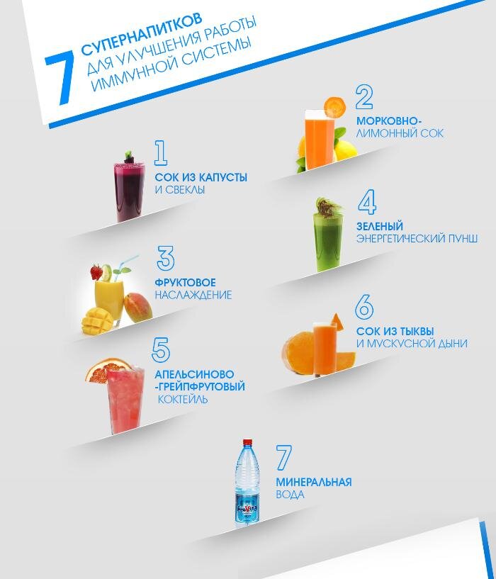 Лучший способ оставаться здоровым — это поддерживать правильную работу иммунной системы, которая отважно борется со старением и инфекциями. Лучший естественный источник витаминов, минералов, антиоксидантов и других питательных веществ — это свежие фрукты и овощи. Однако, непросто употреблять в пищу рекомендуемое количество фруктов и овощей каждый день. Чтобы решить эту проблему, можно быстро готовить из них простые коктейли. Попробуйте эти удивительные напитки, которые также служат отличными иммуностимуляторами. Сырая белокочанная капуста и сок свеклы Капуста полна минералами, витаминами и антиоксидантами, способствующими правильной работе иммунной системы. Свекла богата солью фолиевой кислоты, необходимой для выработки белых кровяных телец, которые борются с чужеродными микроорганизмами. Выжмите одну свеклу и 4-5 листьев капусты. Добавьте кубик льда и получите освежающий напиток. Морковно-лимонный сок Выжмите сок из четырех больших морковок с мякотью. Затем добавьте выжатый сок поло