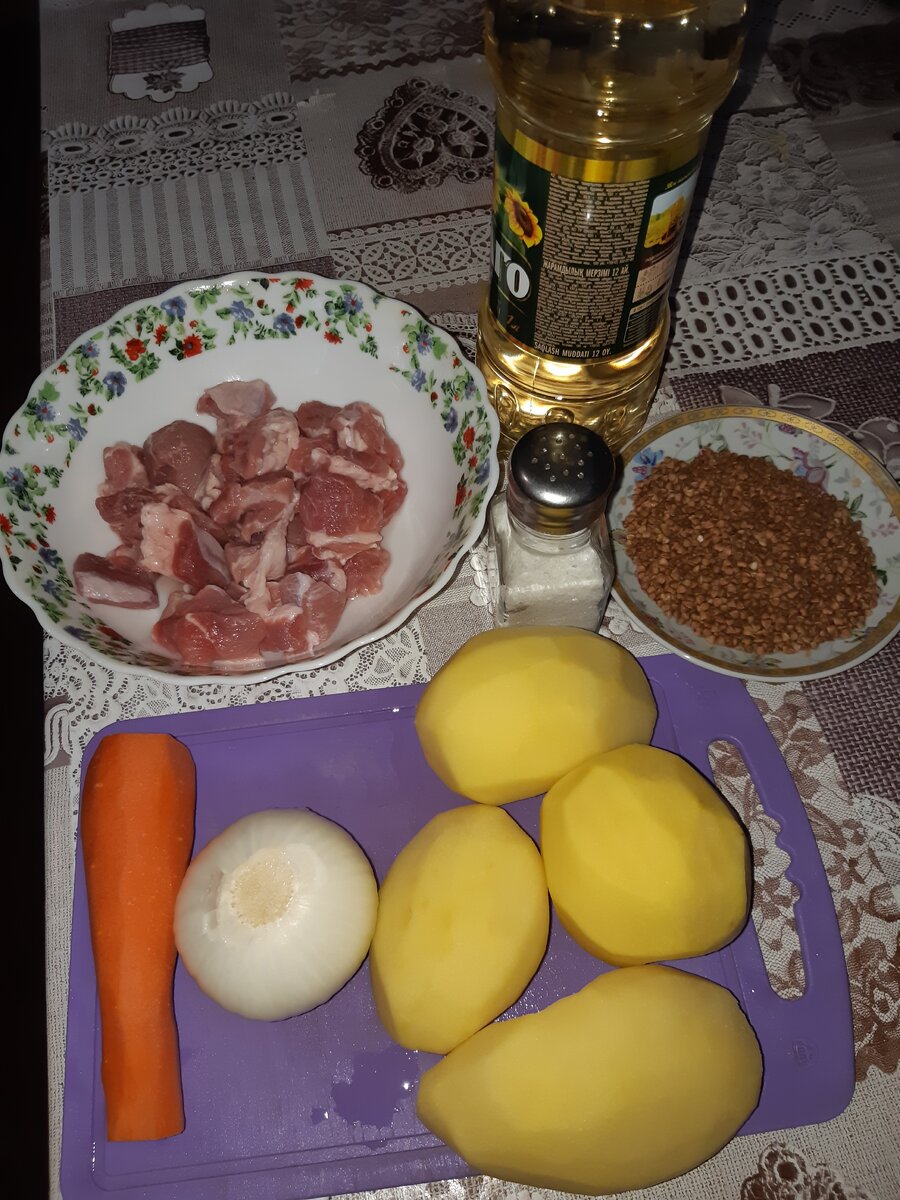 Всем привет! Добро пожаловать на канал "Мамин кулинар". На сегодняшний день тема гречки актуальна для всех нас. И я готова вам поведать секретный рецепт моей бабушки по приготовлению гречневого супа. И так, значит, берем: мяско свининки либо курочки 300 г, картошечки штучки 4 средних размеров, гречечки 5 ст. л, морковочку 1 шт, лучок 1 шт., соль 2 ч.л., воду 2.2-2.3 л., масло растительное 20 мл. Нарезаем наше мяско, картошечку и лучок кубиком, морковочку трем на крупной терочке. Нашу водичку наливаем в кострюлечку, кладем туда мяско, пока ждем закипания водички, на вторую конфорку ставим сковородочку в нее наливаем маслице и кладем лучок. Обжарив лучок до золотистого цвета, добавляем в сковородочку морковочку, тушим 5 минут на маленьком огоньке накрыв крышечкой. После тушения морковки с лучком у нас как раз должна закипеть водичка, снимаем накипь от мяска и добавляем соль. И вот мы подобрались к Секрету моей бабушки - берем, значит, гречечку и добавляем в сковородочку к нашим лучку и