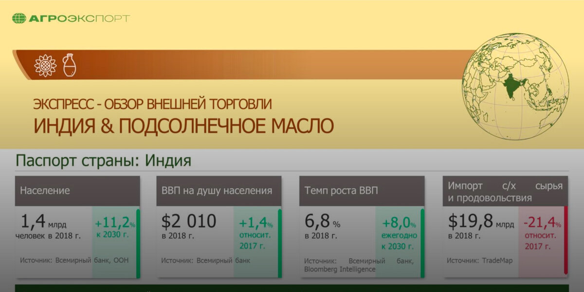 Индия является крупнейшим мировым импортером подсолнечного масла, по итогам 2019 года ее доля в общем мировом импорте составила более 17%.