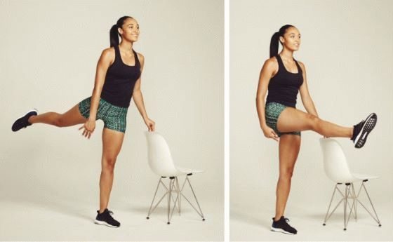 В этой статье расскажем какими простыми упражнениями можно быстро уменьшить объём живота, бедер и талии простыми упражнениями в домашних условиях. Кроме всего перечисленного выше, такие упражнения укрепят каркас спины, уменьшат объем талии, улучшают осанку. Для выполнения этих упражнений понадобится устойчивый стул со спинкой или любая соответствующая опора. Упражнение 1 Исходное положение: встаньте прямо, ноги вместе, левой рукой держитесь за спинку стула. Стул стоит слева от Вас. Выполнить 5 махов правой ногой вперед. Начиная с небольшого отрыва от пола и доведя подъём ноги вверх до максимального. Вернуться в исходное положение. Выполнить 5 махов правой ногой назад. Начиная с небольшого отрыва от пола и доведя подъём ноги вверх до максимального. Вернуться в исходное положение. Повернуться так, чтобы стул был справа от Вас. Выполнить 5 махов левой ногой вперед. Начиная с небольшого отрыва от пола и доведя подъём ноги вверх до максимального. Вернуться в исходное положение.