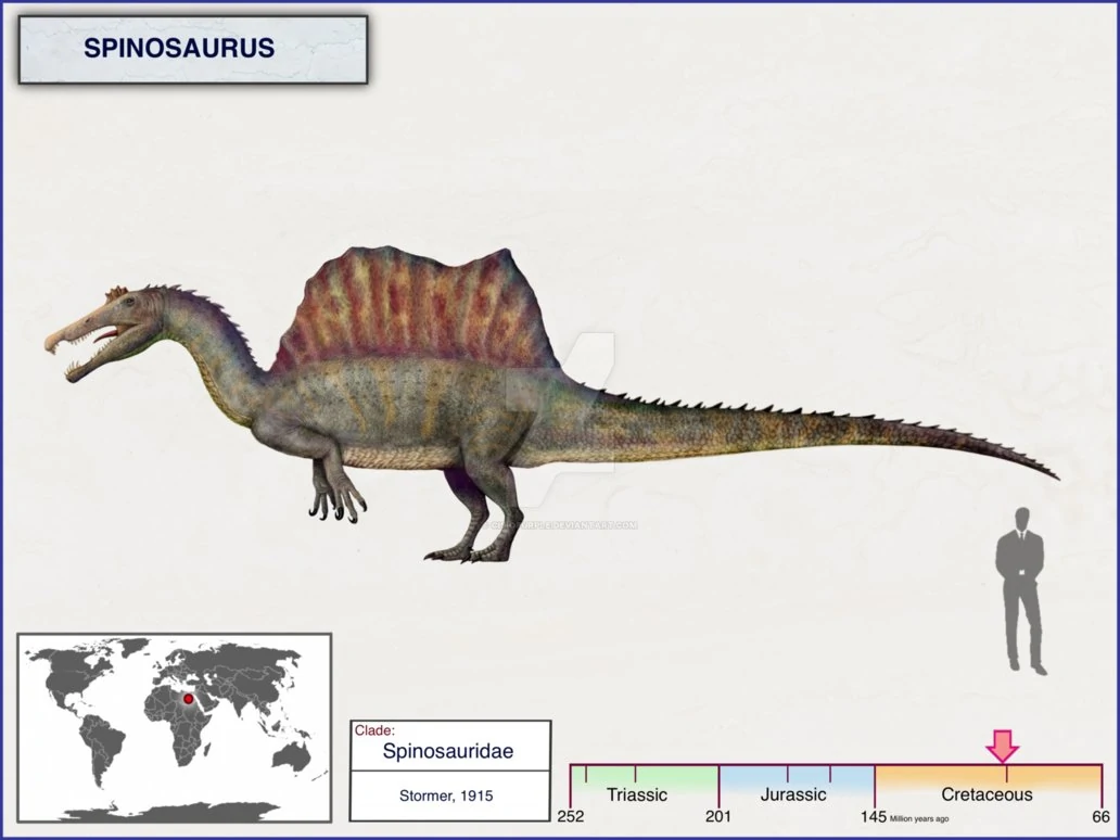 Было бы странно не упомянуть этого ящера. Считалось, что это был большой двуногий хищник с округлым гребнем на спине, который ходил по будущей северной Африке и ел разнообразную водную живность (рыбу, например). На этой почве, многие школьники-динофаны очень полюбили спинозавра. Ещё бы: огромный хищный ящер больше тираннозавра рекса в длину да ещё с "парусом" на спине и длинной крокодильей мордой. Однако, новые исследования показали, что этот ящер был не таким крутым: передвигался он частично на четырёх ногах, иногда вставая на две, "парус" на спине у него был не округлый, а угловатый, да и отпор он мог дать разве что какому-нибудь местному крокодилу, ну и небольшим динозаврам, таким как ругопс, например. Школьники, само собой, бомбанули, и у нас на вики были целые словесные баталии по этому поводу. Благо, сейчас они закончились. Зато новейшее исследование показало, что он не только ходил по большей части на четвереньках, но и был полуводным хищником, совсем как крокодил, а ещё у него был веслообразный хвост, с помощью которого он передвигался, аналогично рыбе или тем же крокодилам, да и образ жизни вёл в чём-то сходный.