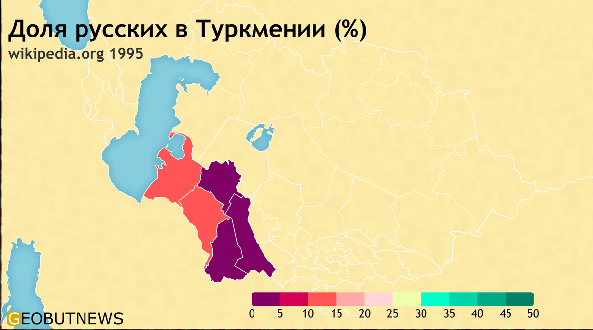 Добрый день, дорогие читатели! Очень много вижу комментариев о том, как все больше и больше русских уезжает из Средней Азии. Основными причинами эмиграции являются экономические и социальные. Даже такую относительно благополучную страну, как Казахстан покидает русскоязычное население. Давайте посмотрим на каждое государство этого региона. Итак, хочется начать с одной из самых закрытых не только в Средней Азии, но и в мире стран - Туркмении. Безусловно, это накладывает свой отпечаток: свежее данных, чем переписи населения 1995 года нет. Было что-то похожее проведено в 2012 году, но результатов в интернете вообще не найти. Ладно, довольствуемся тем, что есть: Перед распадом, в 1989 году численность русских достигала 333,9 тыс. человек. Это составляло 9.5% от всего населения республики. Через 6 лет в стране осталось уже 298,8 тысяч человек. Почти половина диаспоры проживала в Ахалском велаяте - 13.2% населения. Русское население достаточно неравномерно заселялось в стране. Например, на се