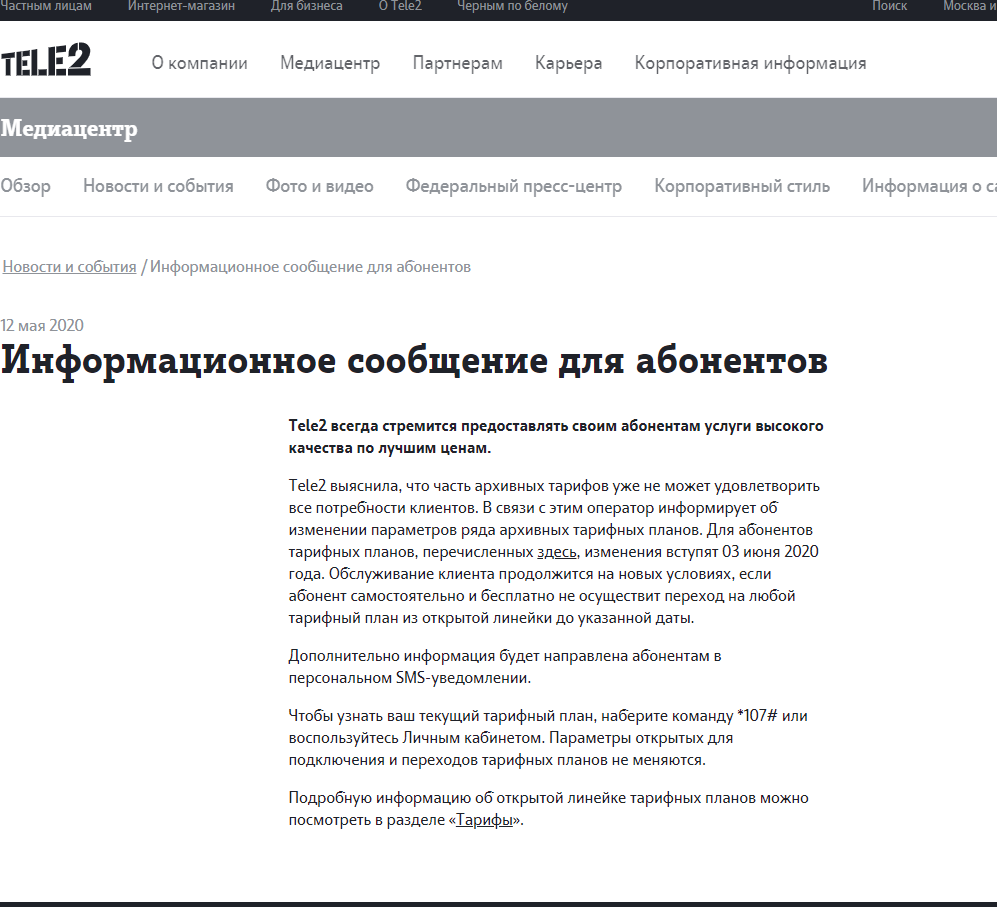 Новость касается только Московского региона, но не факт что новость опубликованная оператором будет и в других регионах России. Заметим что Tele2 в своей новости написал очередную бессмыслицу про то что Tele2 всегда стремится предоставлять своим абонентам услуги высокого качества по лучшим ценам», а также «Tele2 выяснила, что часть архивных тарифов уже не может удовлетворить все потребности клиентов».