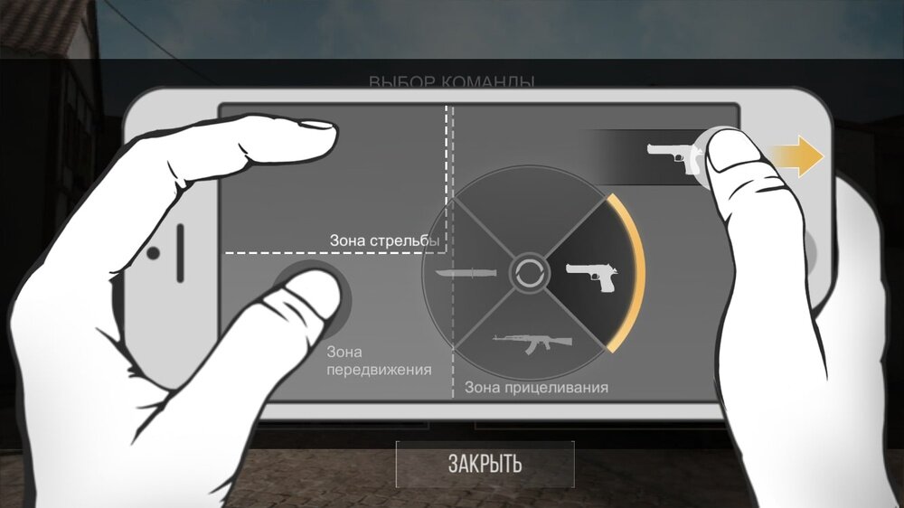 Управление ничем не отличается от других игр FPS. Чтобы совершать основные команды, которые важны в любом шутере (передвижение, прицеливание и стрельба), разработчики советуют использовать большой и указательный пальцы левой руки и большой палец правой. Для этого экран разделен на 3 зоны. Во время самой игры в нижнем левом углу будет джойстик для ходьбы, внизу справа кнопки для прицела, перезарядки и приседания, двойное нажатие по правой зоне служит для прыжка. Чтобы сменить оружие или взять бомбу — достаточно нажать на кнопку «Оружие» и провести пальцем в направлении желаемого. Также вы можете стрелять во время прицеливания, но в таком случае жертвуете либо точностью выстрела, либо передвижением. Все кнопки на экране можно настроить по своему усмотрению.