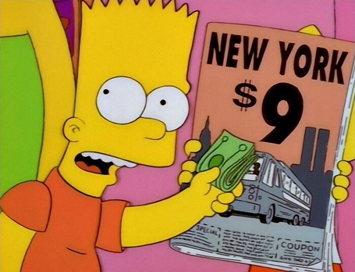 Во время первой поездки Симпсонов в Нью-Йорк в серии 1997 года фигурировал журнал с рекламой билетов за 9 долларов. На заднем плане виден Нью-Йорк с двумя его символами, башнями-близнецами “Всемирного торгового центра”. Вместе эта картинка формирует число 9/11. Кроме того, когда Лиза держит этот журнал, сверху выглядывает треугольник её волос, что некоторые исследователи связывают с массонской пирамидой “Всевидящего ока”.