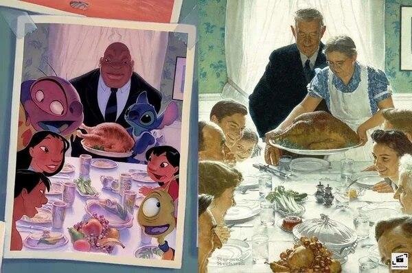 В "Лило и Стич" можно увидеть фото героев за столом, которое в точности копирует картину Нормана Роквелла "Свобода от нужды".