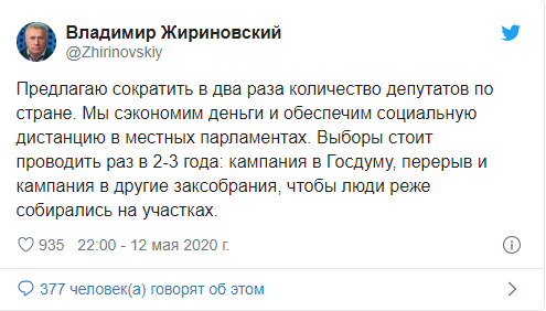 Это выгодное и несомненно нужно решение не только предложили, но и воплотили в жизнь в других странах. Речь идет о сокращении зарплат депутатам или сокращение их численности. Сокращение количества или же понижение их заработных плат хотя бы на 20% снизит нагрузку на бюджет в это непростое время, и даст возможность распределить сэкономленные деньги для поддержки населения. Однако президент подобное решение даже не обсуждал, несмотря на его неоспоримую выгоду. Владимир Жириновский вчера предложил нечто подобное, написав об этом в Твиттере. Несомненно, политик прав, но поддержит ли его решение правительство - большой вопрос. Пока что мы видим что депутаты, прекрасно понимая ситуацию в стране, не собираются отказываться от суммы, равной хотя бы 20% их заработной платы.