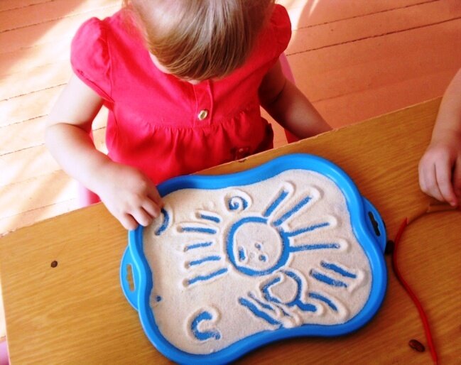 Подходит детям с трёх лет. Тонким слоем насыпаем на поднос/большую тарелку/ блюдо манную крупу/песок/муку. Предлагаем ребенку нарисовать различные изображения.