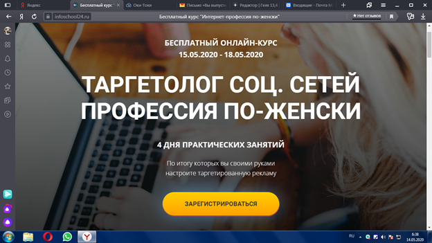 Я вчера записалась на бесплатный вебинар, на котором узнала о новой для меня профессии таргетолога.Ссылка на статью: https://zen.yandex.ru/media/id/5e85de02fc87c305e294784c/kak-stat-targetologom-5ebb856c7d92e9581730937e?from=editor. И, конено же, Яндекс теперь подсовывает мне все больше всяких треннингов, на эту тему. Сегодня увидела приглашение на бесплатный он-лайн курс, решила записаться: Вот что они мне обещают: Есть короткие подготовительные уроки, что мне понравилось, но, увы, ничего конкретно на этих уроках не дается, еще бы, захотели, на подготовительных уроках да бесплатно! Сплошная презентация, обещание легких денег. Лектор Ирина Изоточкина, в прошлом сотрудник салона связи рассказала, что ее жизнь кардинально изменилась и теперь она получает более 150 000 в месяц. Я тоже так хочу, почему за бесплатно и не пройти 4-х дневное обучение. Хотя, конечно же это будет подогрев к тому чтобы я выложила энную сумму, после которой я стану баснословно богатой. К