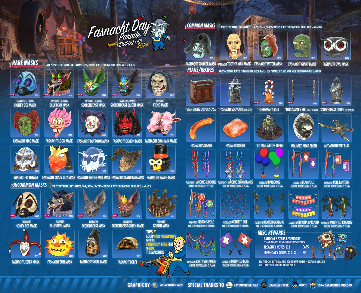Common - распространённые Fallout 76 ☢ ️Награды за Фастнах 👺 2024 Информацию о масках смотрите в этой статье. За удачное прохождение события "Фастнахт" дают не только маски, но и схемы для украшения кампа. Редкие маски Маска солнца для Фастнахта Маска шута для Фастнахта Маска Гоблина для Фастнахта Маска черепа для Фастнахта Маска зубастого человека для Фастнахта Маска старика мороза для Фастнахта Маска совы для Фастнахта Маска великана для Фастнахта Маска солдата для Фастнахта Маска ведьмы для Фастнахта Маска ворона для Фастнахта Маска Когтя смерти для Фастнахта Маска безумца Шлем старика мороза Обратите внимание, это не внешняя модификация. Это готовый Шлем силовой брони! Карнавальный берет для Фастнахта Как проходит событие Фастнахт Событие начинается в начале каждого часа. Ваша задача поговорить с распорядителем праздника, выполнить задания участников парада и пройти праздничным шествием по улицам городка. В финале