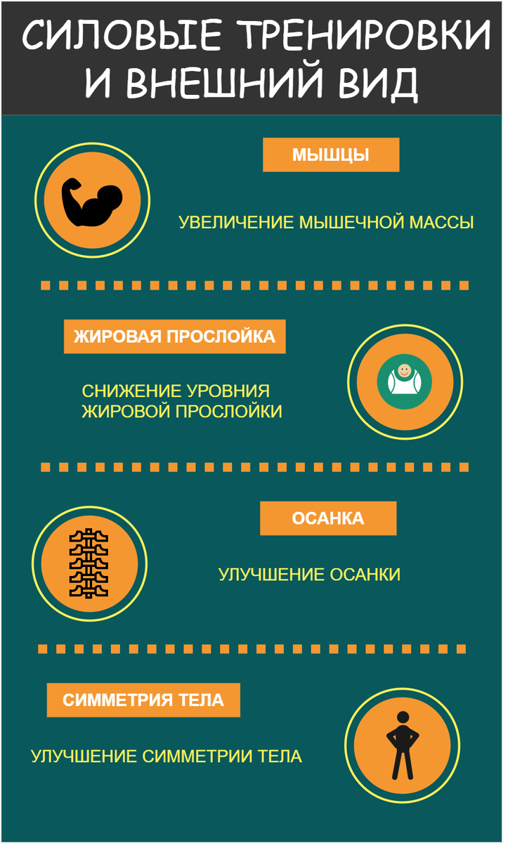 Здесь вы узнаете о влиянии силовых тренировок на внешний вид: мышечный объем и рельеф, уровень жировой прослойки, общая симметрия тела, как заметить даже самые маленькие изменения на начальных этапах тренировок, какие тренировки подойдут для подобных изменений. К силовым тренировкам (также тренировки с отягощением) можно отнести занятия с дополнительным отягощение: гантели, штанги, гири, силовые тренажеры, занятия с различными эспандерами, тренировки с собственным весом Мышечная масса является необходимым фактором здоровья. здесь учитывается не только ее роль в обеспечении движения, ходьбы, поддержания осанки, но и ее влияние на обменные процессы энергии и белка между тканями организма. МЫШЕЧНАЯ МАССА Силовая тренировка является основным фактором для увеличения мышечной массы человека. Под действием тренировки мышцы становятся больше, более заметными, рельефными. ЖИРОВАЯ ПРОСЛОЙКА Силовая тренировка помогает снижать уровень. На изменение уровня жировой прослойки прямое влияние имеет
