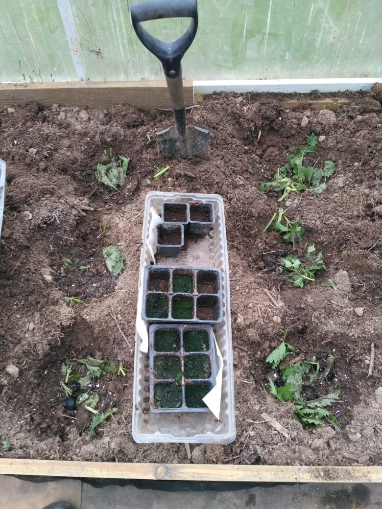 Май в этом году в Подмосковье выдался холодным. Да и овощная рассада вела и ведёт себя непредсказуемо: посаженное в Москве и стоявшее на застеклённом балконе, который находится с северной стороны, как правило, получилось чахлым или попросту не взошло. Вот и пришлось уже на даче в поликарбонатном парнике досаживать и выращивать новую рассаду и для самого парника, и для огородных грядок. А ещё пришлось устраивать, своего рода, «парниковый конвейер»: выращивать рассаду и высаживать, не только то, что выжило на московском балконе, но и досаживать новую. На переднем плане две шестиместные кассеты, с посаженными семенами огурцов ещё в Москве. Земля сверху аж позеленела, но ничего не проклюнулось. Три отдельные – посажены на даче. Жду. При этом я увидел даже некоторое преимущество разновременной посадки: в разное время, надеюсь, и созревать будут огурцы, помидоры и баклажаны с перцами, которые высаживаю в общем для них парнике. Знаю, что каждому овощу нужны свои условия, но раз уж нет нескол