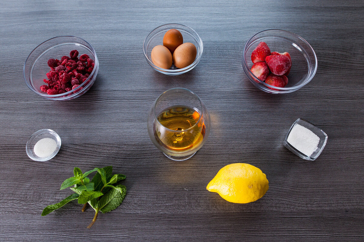 Смесь замороженных ягод (малина и клубника) 180г Коньяк 30г Яйца 3 шт. Сахар 40г Ванильный сахар 5г Цедра одного лимона Мята Приготовление: Совет от шефа: Чтобы яйца стали абсолютно чистыми, их нужно замочить в уксусе, попрыскать антисептиком, помыть под проточной водой с губкой и просушить Сервировка:
