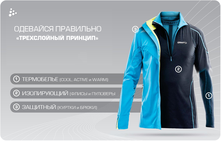 Во время интенсивных физических нагрузок тело человека выделяет пот, и чем выше нагрузка, чем экстремальнее условия, чем выше эмоциональное напряжение, тем больше пота выделяется. Если вы не носите функциональную одежду, то пот будет задерживаться в нижнем белье, поры будут заблокированы и дальнейший его отвод от тела будет невозможен. Пот будет оставаться на месте и блокирует поры. Без высвобождения пота, естественный тепловой баланс будет нарушен. В конце концов одежда отсыреет, охолонет и потяжелеет, беспощадно препятствуя вашей деятельности. Но если Вы носите функциональную одежду, то Ваша кожа будет оставаться сухой, тело будет поддерживать естесственный температурный баланси и это даст Вам возможность сосредоточиться именно на занятии спортом. Каждый слой функциональной одежды Craft, дополняет предыдущий, создавая идеальный микроклимат и обеспечивает основу для оптимальной производительности. Первый слой - ТЕРМОБЕЛЬЁ Это ближайший к телу слой одежды.