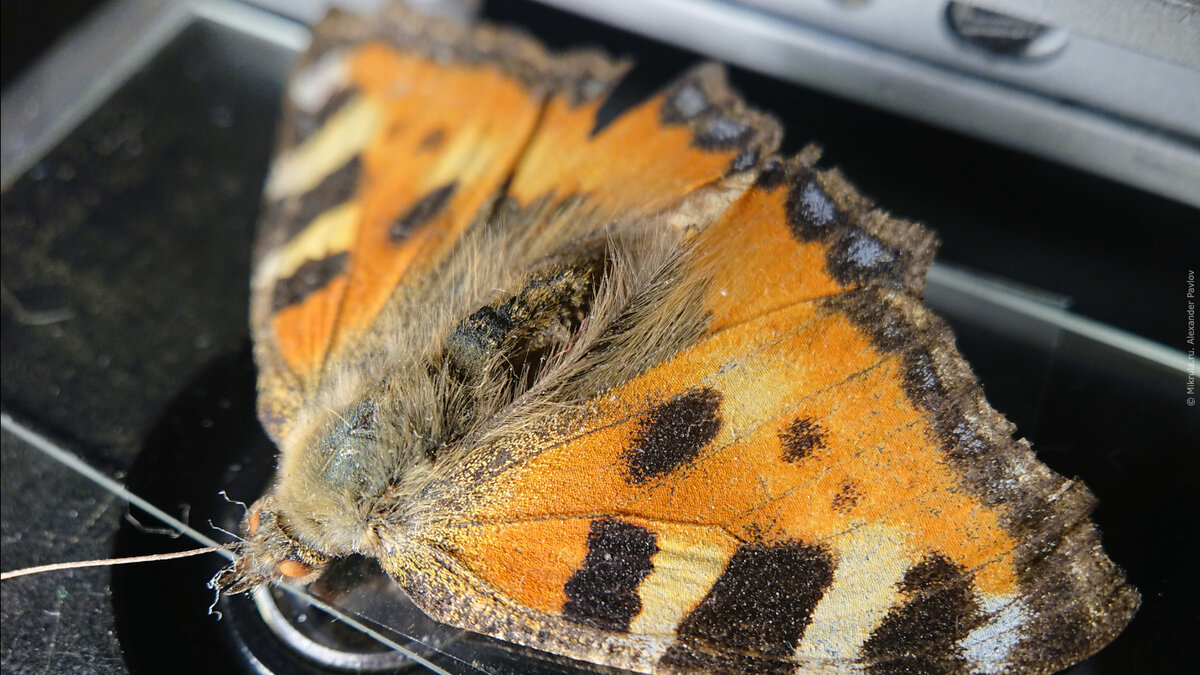 Я уже рассматривал бабочку под микроскопом, где показал её с разных ракурсов, не останавливаясь на деталях. Теперь внимательно посмотрим на крыло. То, что оно покрыто чешуйками, видно и невооруженным глазом. Но сами чешуйки хорошо различимы только при увеличении в 100 раз. Бабочку я нашел обездвиженной на подоконнике. Видимо лежала она там уже давно, на крыльях полно пыли. По краям чешуек зубцы. Похоже на лепестки космеи. Обратная (нижняя) сторона крыла покрыта таким же «оперением». Я сказал «оперением», потому что каждая чешуйка, действительно, очень похожа на перо. Она широкая и крепится к крылу крохотным отростком (на фото он справа). Вот тот вырост на крыле, к которому крепится чешуйка. Крепление очень не надёжное и от любого касания бабочка легко теряет свои «пёрышки». В этом месте чешуек почти не осталось, а то, что есть напоминает тюльпаны? Надо же, не первый раз смотрю бабочку в микроскоп, а на место крепления обратил внимание только сейчас. Стоит ли столь же подробно рассмотре
